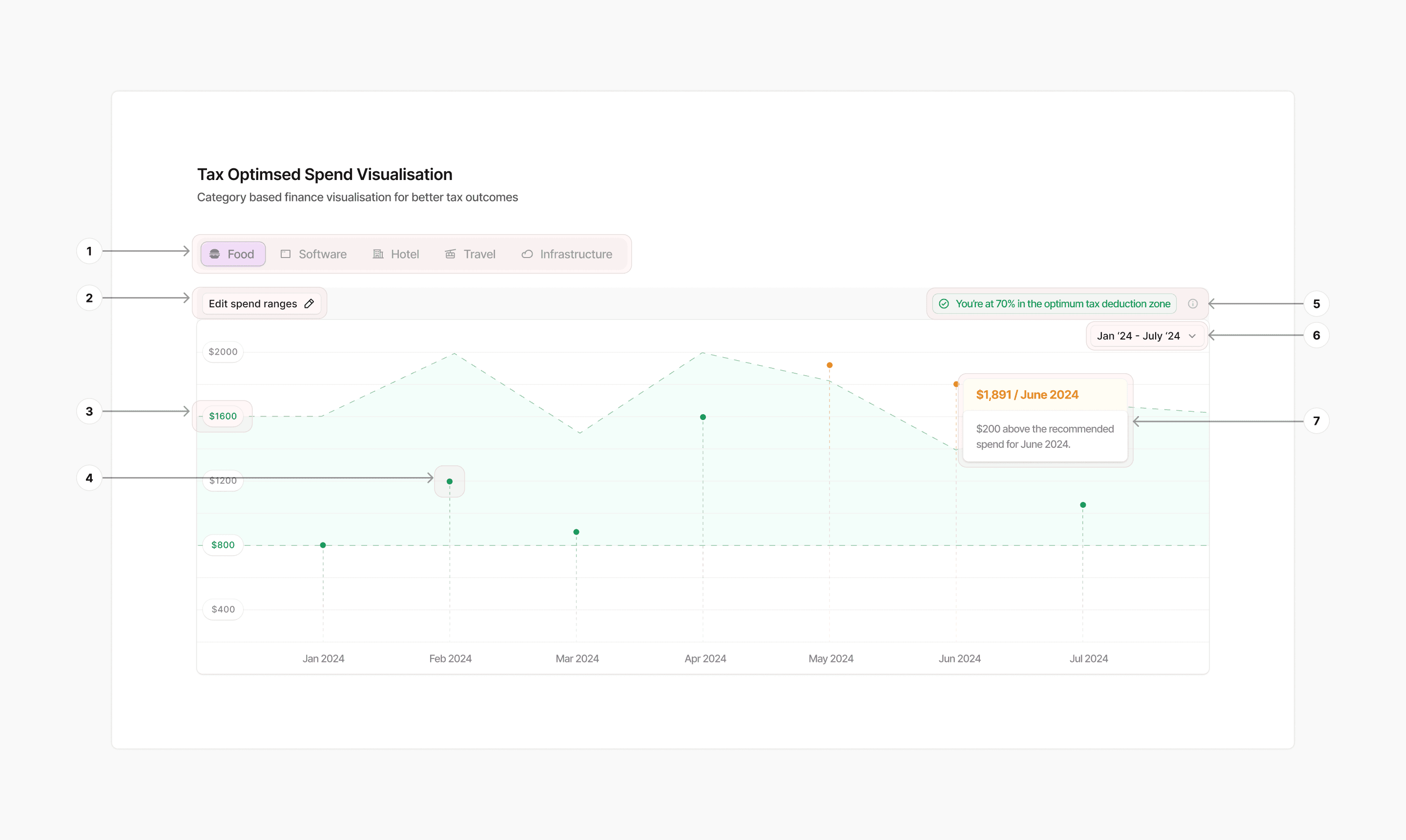 Hover states explain why a month is flagged (e.g. “$200 above recommended spend for June”), adding clarity without clutter.
